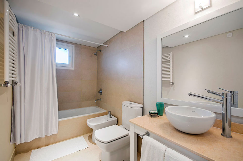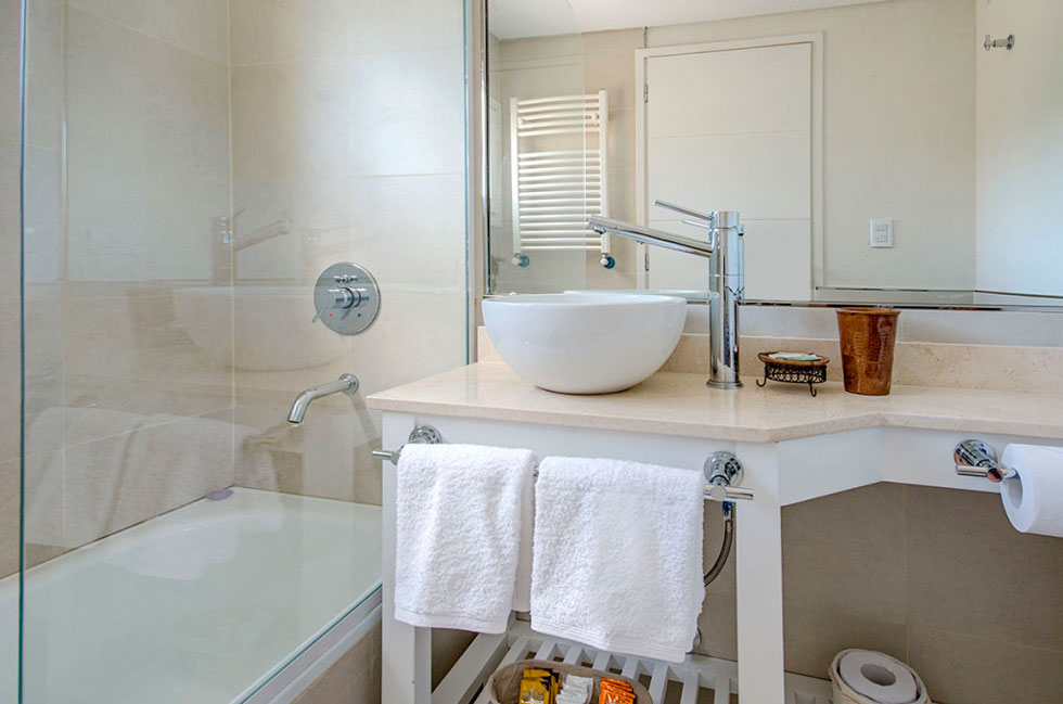 Baño completo con bañadera y secador de pelo.