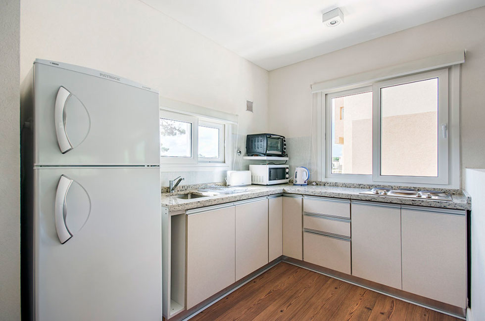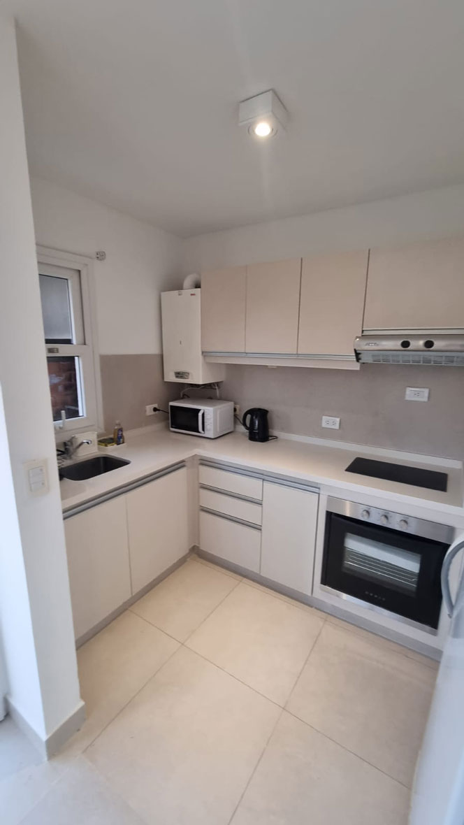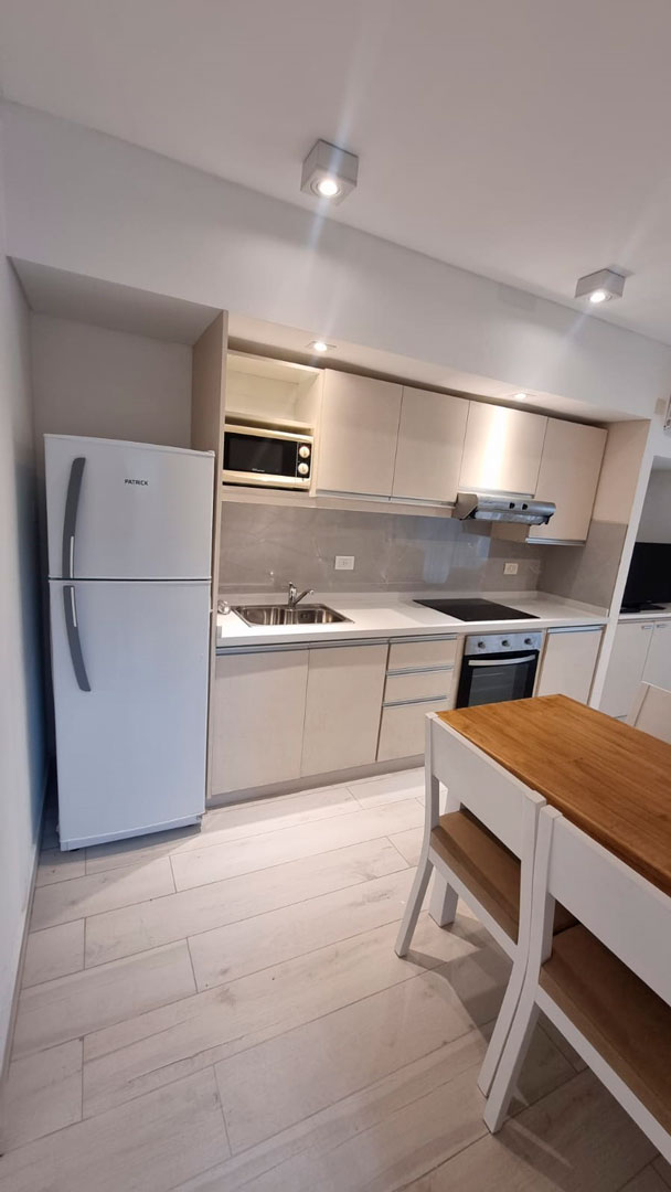 Cocina equipada con heladera, freezer, anafe eléctrico, horno eléctrico, microondas, tostador, cafetera y