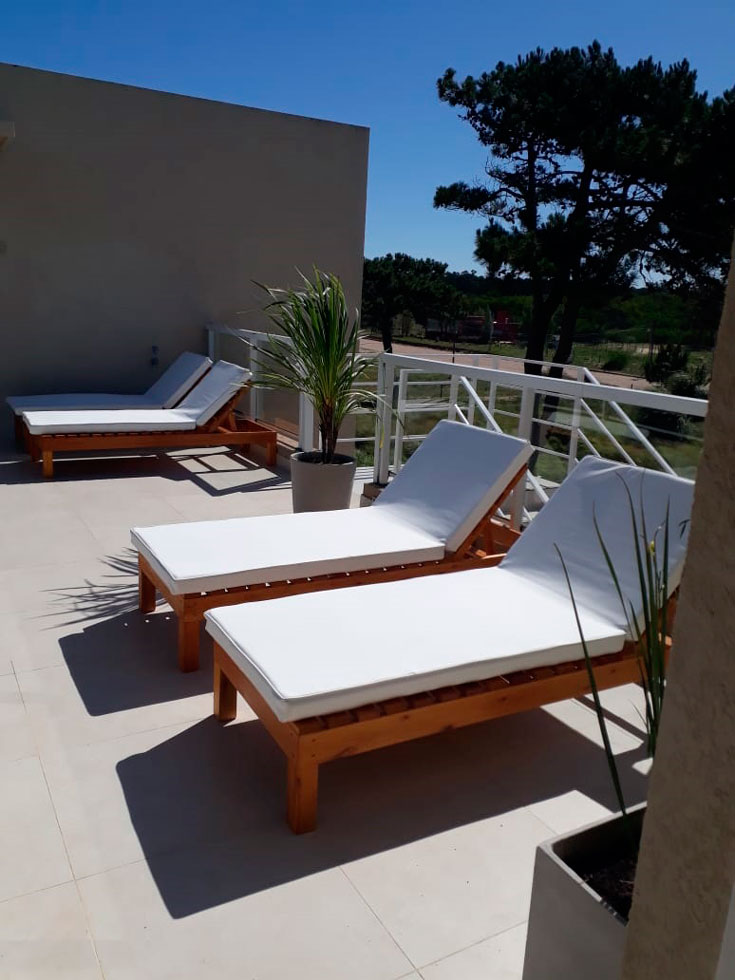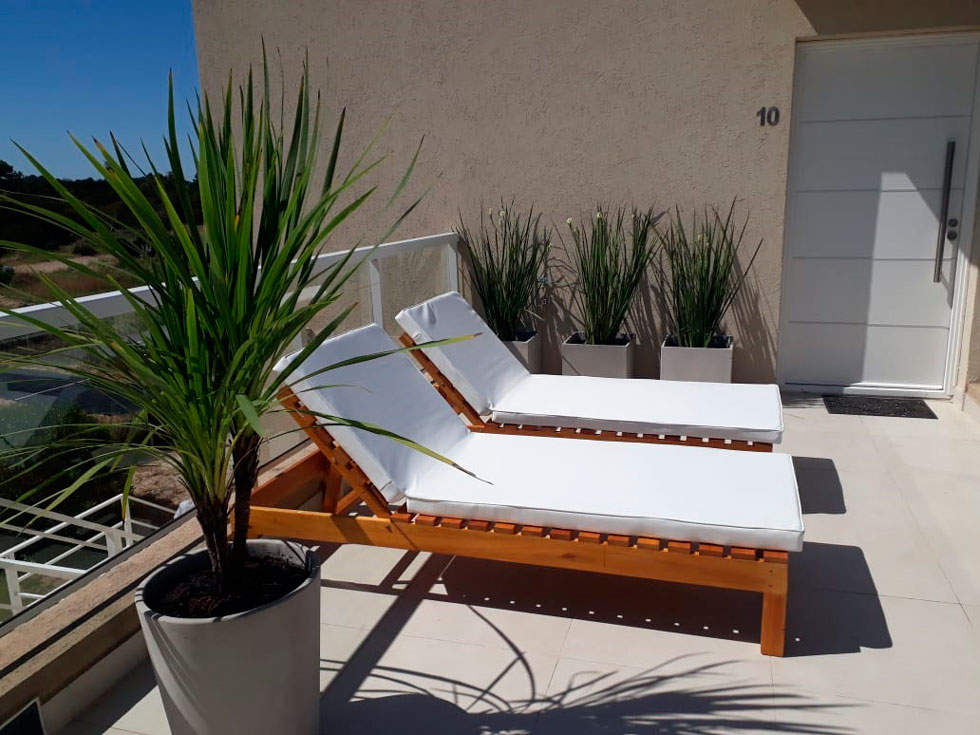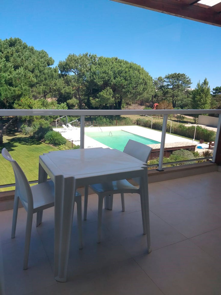 Los monoambientes cuentan con área de dormitorio con cama matrimonial de 1,80m x 2m, ropa blanca, escritorio, TV LCD de 32 pulgadas, servicio de TV por cable, WIFI, aire acondicionado frío-calor, y caja de seguridad. Baño completo, secador de pelo, jabón y shampoo de cortesía. Cocina equipada con heladera con freezer, anafe eléctrico, horno eléctrico empotrado, microondas, tostador, cafetera y vajilla completa para 3 personas. Balcón terraza con parrilla individual más una terraza solárium compartida con reposeras. Vista abierta al jardín, bosque de pinos y pileta. Todos los ambientes tienen aberturas de PVC con doble vidrio, mosquitero y cortinas Roller con Black out.