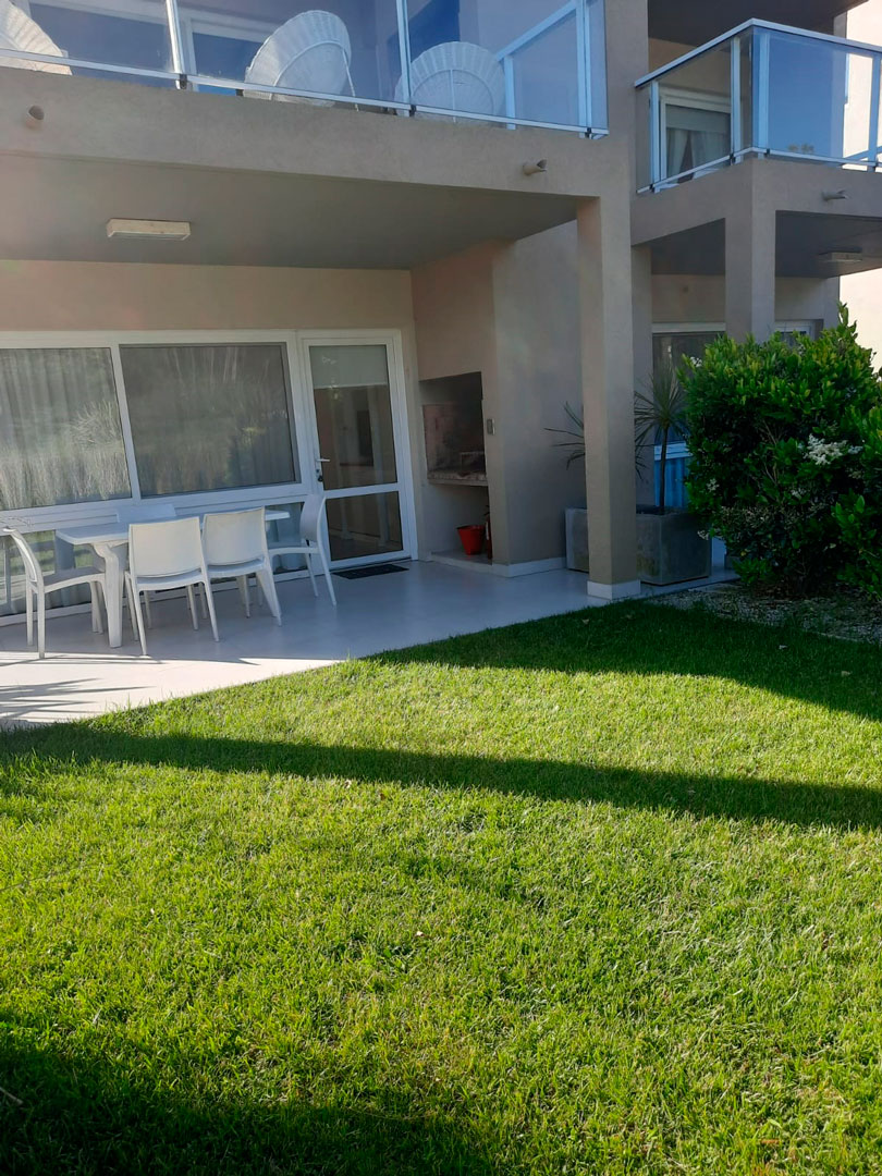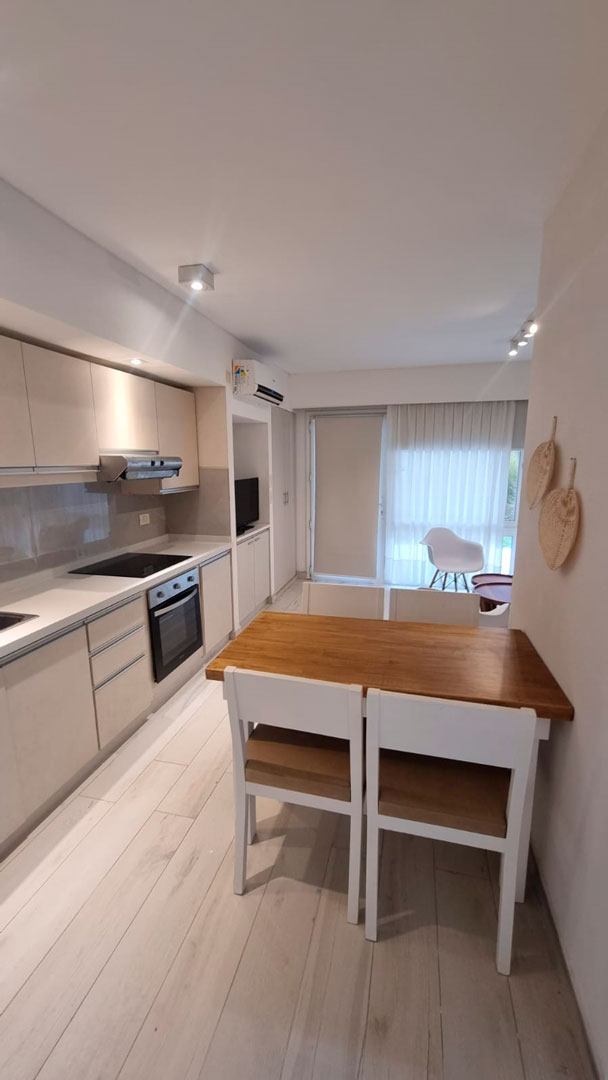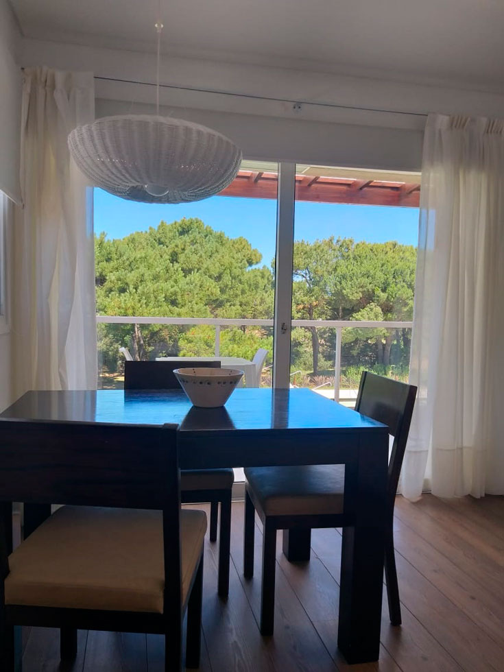 Cocina equipada con heladera, freezer, anafe eléctrico, horno eléctrico, microondas, tostador, cafetera y vajilla completa para 5 personas. Vista abierta al jardín, bosque de pinos y pileta. Todos los ambientes tienen aberturas de PVC con doble vidrio, mosquitero y cortinas Roller con Black out, pisos de madera en dormitorio y living comedor.