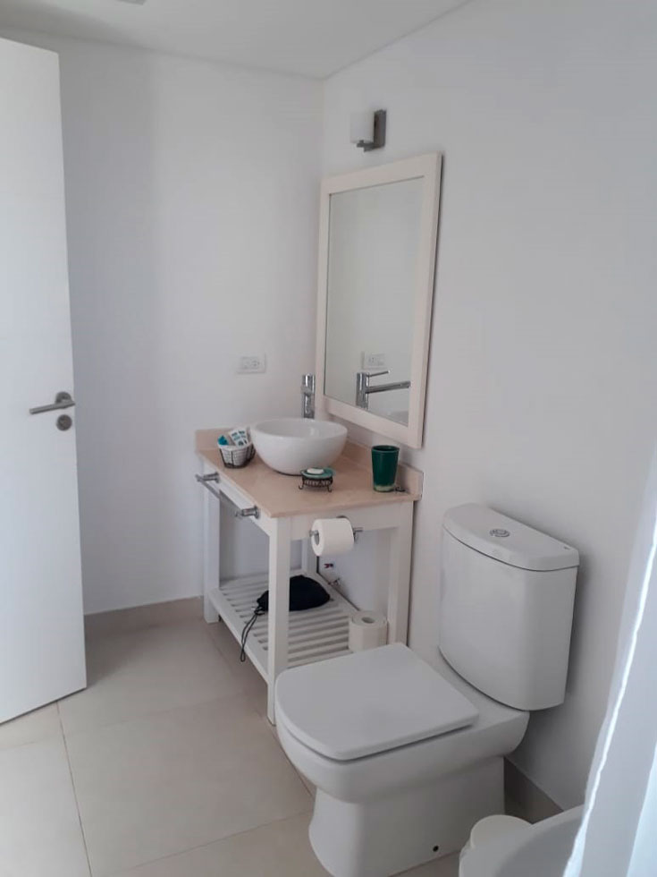 Balcón terraza con parrilla. Baño completo con bañadera y secador de pelo.