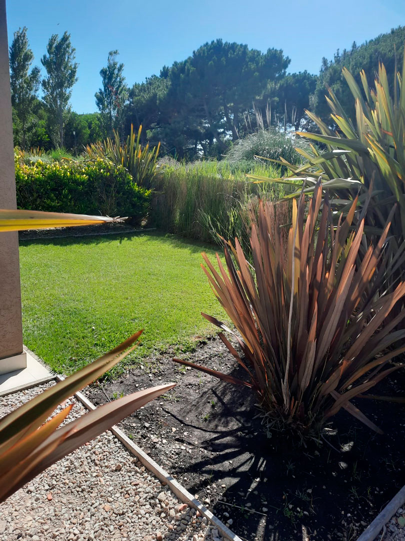 Vista abierta al jardín, bosque de pinos y pileta.