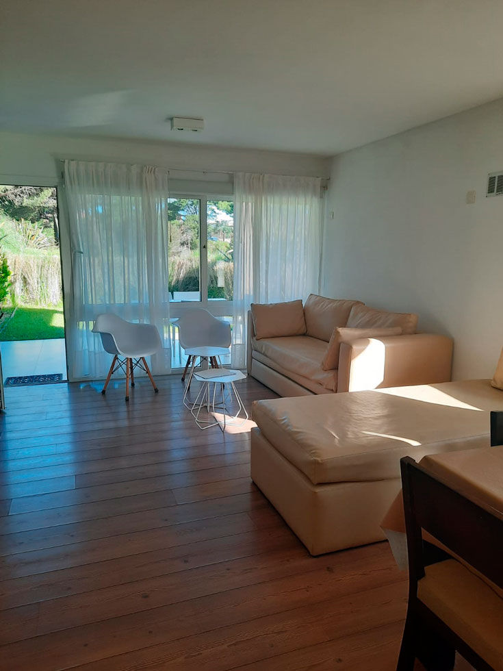 Cocina equipada con heladera, freezer, anafe eléctrico, horno eléctrico, microondas, tostador, cafetera y vajilla completa para 5 personas. Vista abierta al jardín, bosque de pinos y pileta. Todos los ambientes tienen aberturas de PVC con doble vidrio, mosquitero y cortinas Roller con Black out, pisos de madera en dormitorio y living comedor.