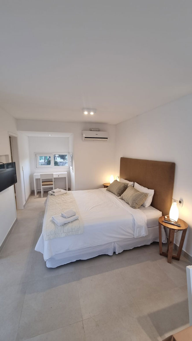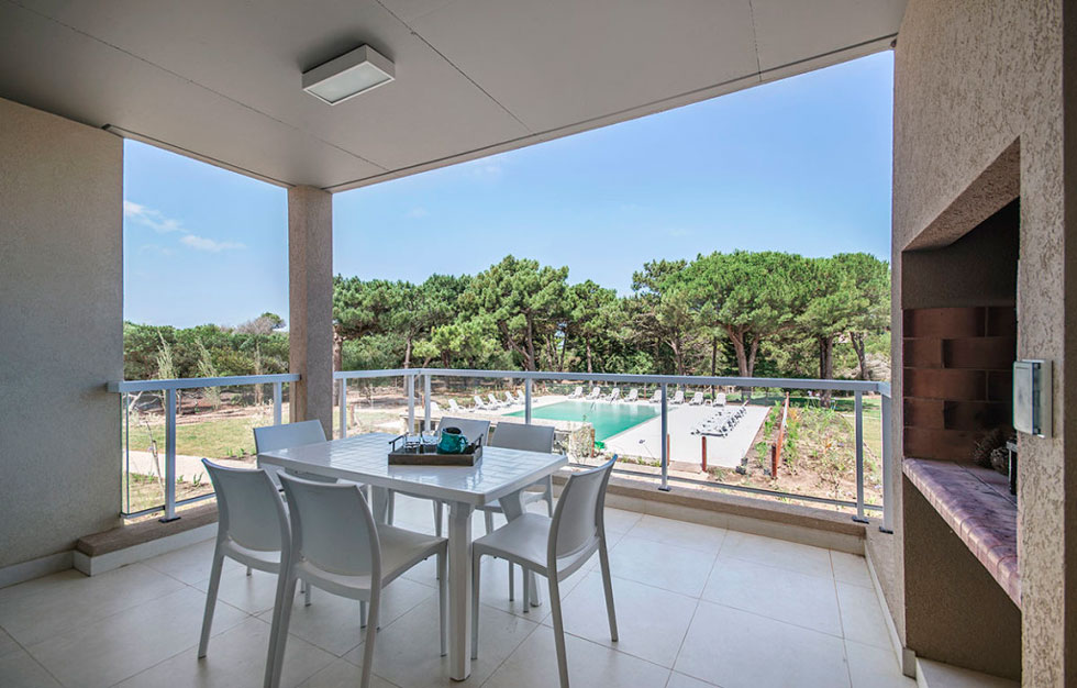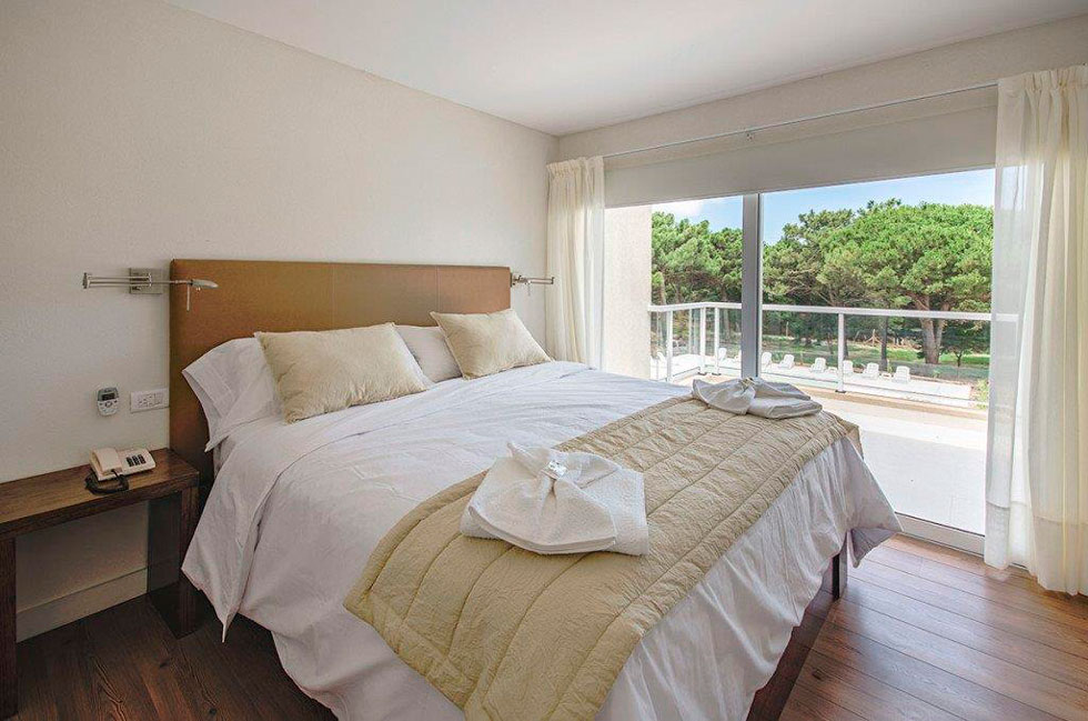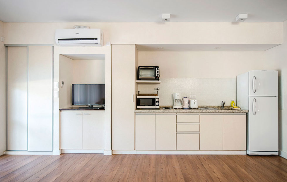 Los monoambientes cuentan con área de dormitorio con cama matrimonial de 1,80m x 2m, ropa blanca, escritorio, TV LCD de 32 pulgadas, servicio de TV por cable, WIFI, aire acondicionado frío-calor, y caja de seguridad. Baño completo, secador de pelo, jabón y shampoo de cortesía. Cocina equipada con heladera con freezer, anafe eléctrico, horno eléctrico empotrado, microondas, tostador, cafetera y vajilla completa para 3 personas. Balcón terraza con parrilla individual más una terraza solárium compartida con reposeras. Vista abierta al jardín, bosque de pinos y pileta. Todos los ambientes tienen aberturas de PVC con doble vidrio, mosquitero y cortinas Roller con Black out.