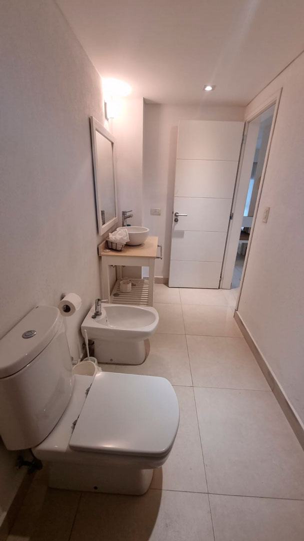 Balcón terraza con parrilla. Baño completo con bañadera y secador de pelo.